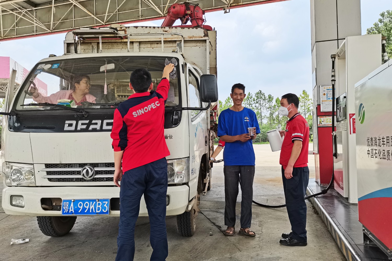 息縣服務區加油站設置專用加油通道,為機收車輛駕駛員送上飲用開水,幫助擦拭車輛玻璃。