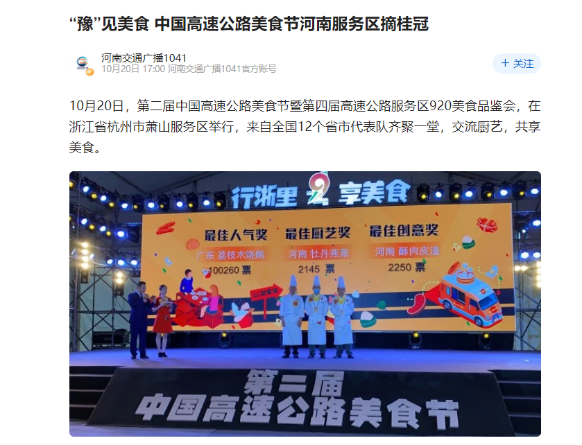 人民日?qǐng)?bào)、大象新聞、河南交通廣播、今日頭條:“豫”見美食 中國高速公路美食節(jié)河南服務(wù)區(qū)摘桂冠